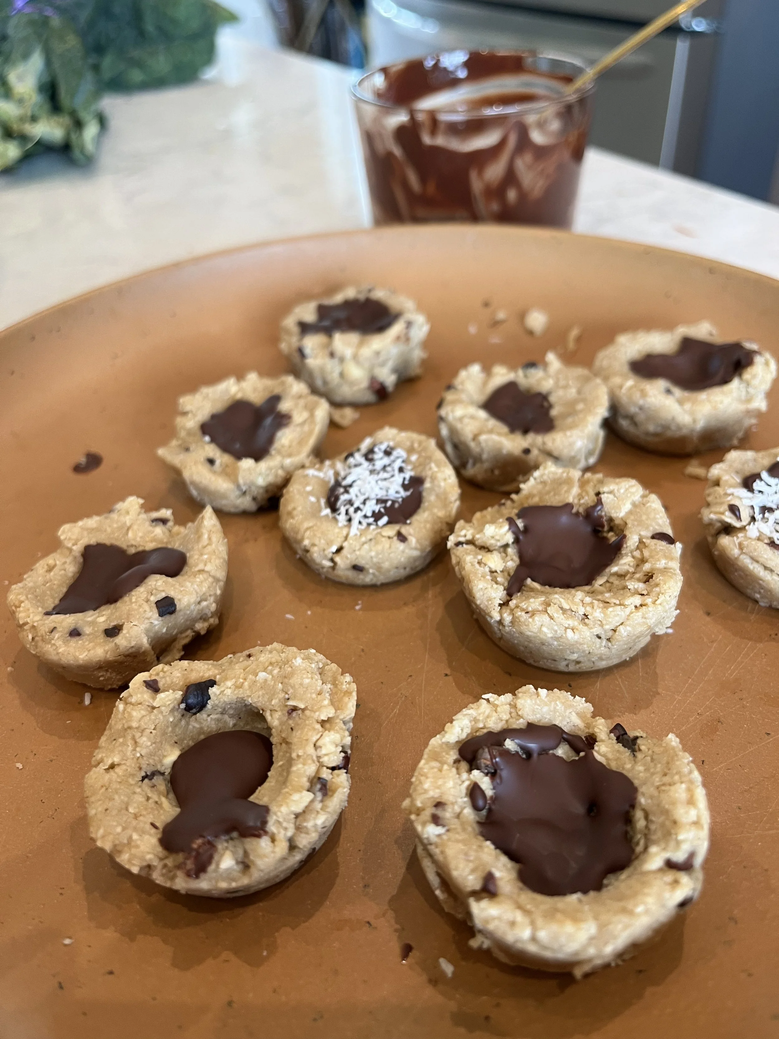 Melt a half bar of dark chocolate in the microwave for 15 secs, mix it up and repeat if needed until the chocolate is melted. Fill each thumb print with melted chocolate, sprinkle with coconut. Put the tray into freezer for 5 mins to firm up. remove with a butter knife.